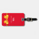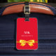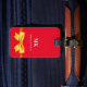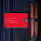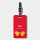 A red background. Decorated with a faux gold looking bow. Personalize and add your monogram letters and full name on the front. Your contact information on the back.