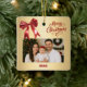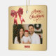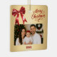 A faux gold looking background, red text and a red bow. Text and photo. Merry Christmas is written with a elegant hand-lettered style font.