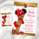 Girl Christmas baby shower invitations with adorable African American baby girl with cute afro hair wearing a cute red outfit on a pretty red and gold poinsettia background. This cute Christmas baby shower invitation is easily customized for your event by simply adding thee text you need for your event.