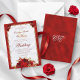 Enjoy luxury at an affordable price with this elegant red floral wedding invitation. A red metallic background, white satin, and a gold filigree jeweled frame combine with rich red roses for the ultimate elegant wedding design. The burgundy text in classic formal fonts can be easily personalized for your own special day. On the back is a decorative script monogram in complementary colors.