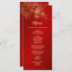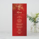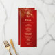 This wedding menu card features a gold floral line art branch and a gold double happiness symbol on a dark red background. With custom bride and groom names, the wedding date and a custom menu text.
