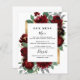 Design features watercolor peony and rose floral elements in shades of red and burgundy over eucalyptus botanical greenery. Template also features a printed gold coloured box for an added elegant layout. The typography displays a modern layout with black text. View the collection link on this page to find matching products within the wedding set.