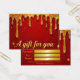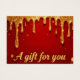 This glamourous, high-end Gift Certificate card is the ultimate way to sell your services or products! The design is ultra-luxurious, featuring a bold red background beautifully contrasted with a dramatic, sparkling gold glitter drip and confetti effect across the top and bottom. The front simply states "A gift for you" in elegant gold script, while the back provides clear fields for the Amount, To, and From, along with space for your company information. It's perfect for beauty salons, high-end boutiques, spas, and personal services looking to convey luxury.