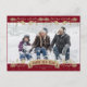 Elegant red and gold botanical photo Happy New Year postcard featuring a red photo frame adorned with holly, berries and falling snow on the front and a watercolor painting of poinsettia, holly and red berries at the back.