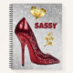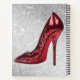 Silver glittery background with a gold heart and flower with a red high-heeled shoe, monogrammed for you to choose your own text.
