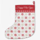 This pretty Christmas stocking features a pattern of red and gold snowflakes which are placed on a white background. At the top is a matching red border with a white diamond shape liner. "Merry Christmas" is in white script at the top. The back of the stocking has the same design, but with a second text field that currently says "Happy New Year". It's easy to change the text to personalize the message. Design credit for the pattern to https://www.etsy.com/shop/ephrazydesign.