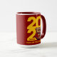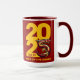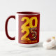Celebrate the Year of the Snake in 2025 with this mug, which features the year 2025 styled in a bold bright yellow font, and AI-generated artwork of a stylized Asian serpent artistically standing in for the number 5 on a royal red background. Customize messaging as desired.