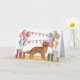 Destei's original cartoon illustration of a mahogany red or reddish brown colour Golden Retriever breed dog standing among some pastel colour birthday balloons, gifts and a bunting banner. The pastel colours include pink, green, blue, red, orange and purple. The dog is standing on a yellow wood floor texture and the background has a playful pastel colour polka dot pattern. On the inside of the card there is also a personalizable text area for a custom message.
