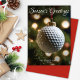 Elegant Christmas card featuring a close-up photo of a golf ball ornament hanging on the branches of a Christmas tree. Card texts fully personalizable. Need help? Contact us for assistance personalizing or with customizations. Happy holidays!