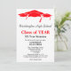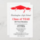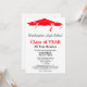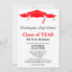 This vertical format minimalist class reunion invitation design features black and red text on an all white background with three red graduation caps as the top border. Personalize your information, remove information or edit using the design tool to select a font colour, size, and style your prefer.
