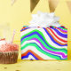 Birthday gift wrap with blue, green, red, white abstract wrapping paper.