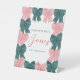 This elegant baby shower "how many bows" pedestal sign features a hand-drawn wreath of striped bows—pink with red stripes and green with navy stripes—for a playful yet elegant look. Perfect for Christmas baby shower! Personalize it for your needs. You can find matching products at my store.