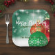 Personalized Christmas paper plate design featuring red and green Christmas baubles on a snowy sparkly green background. The text is fully customizable. To change it use the Personalize option. For more changes, such as changes to the font, font colour or text layout, use the Edit design tool option.