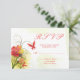 This stylish chic 3.5x5 Wedding RSVP reply flat card has a red and green watercolor floral design with two butterflies flying at the bottom left. At the bottom, there is a soft grey silhouette of some water lily flowers. In the background, there is a soft green distressed look. On the right, you can easily customize the wedding RSVP information. On the backside, there is a red butterfly flying on the left side.