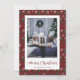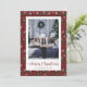 Nostalgic red, green and white ugly sweater photo Christmas cards featuring Santa Claus, reindeer, snowflakes, trees and baubles. Easily personalize these ugly sweater Christmas cards with your photo and family name.