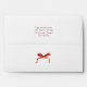 Add a festive finishing touch to your holiday mail with this elegant envelope featuring a whimsical watercolor ribbon design on the front and back. The hand-painted bow adds a charming, artistic touch while your personalized return address is printed on the reverse for a beautifully coordinated look. Perfect for Christmas cards, holiday party invitations, seasonal thank-you notes, and festive correspondence, this envelope brings style and personality to every piece of mail. Pair it with matching cards or stationery from the collection for a cohesive and delightful holiday presentation.