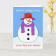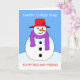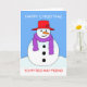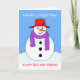 A cartoon snowman wearing a red hat and a purple scarf, accompanied by the words 'Happy Christmas to my red hat friend'.