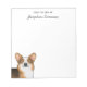 Destei's original cartoon illustration of a red headed tricolor Pembroke Welsh Corgi breed dog's head close-up. The dog portrait design is placed in the bottom left corner. There are also two personalizable text areas on the top that now reads: "From the desk of" together with a personalizable name.