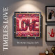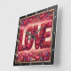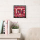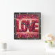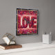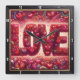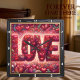 This stunning square wall clock features an intricate typographic masterpiece where the word "LOVE" is formed from a dense mosaic of hundreds of tiny, individual hearts. The letters are rendered in a rich gradient of crimson, magenta, and soft pink, creating a 3D textured effect. The surrounding background is a lush, swirling tapestry of abstract floral patterns, heart shapes, and flowing ornaments that blend seamlessly into a warm, glowing ivory center. The artwork is set within a modern black wood-grain frame with bold white numeric markers for easy readability. This functional home accessory is a perfect decorative piece for bedrooms, living rooms, or as a sophisticated Valentine Day gift. Its high-detail composition and powerful romantic theme provide a vibrant and artistic focal point for any wall.