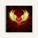 Bright red heart of an angel with golden wings shining in the dark radiant red background decorated with a pattern.