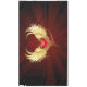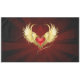 Bright red heart of an angel with golden wings shining in the dark radiant red background decorated with a pattern.