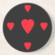Digitally created pattern of five red hearts, one of them in a bigger size in the middle, the other four on top of the coaster, on the bottom and the right and left sides of it. They are placed on a black background. You can easily change the colour of the background.