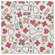 Fabric for nurses, doctors, and health care workers in white with a pattern of stethoscopes, medicine, thermometers, band-aids in brown and beige, and hearts.