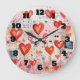 A clock with a fun mixed media style pattern. Big red hearts and various random shapes scattered around making a delightfully cute pattern.