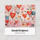 Business cards with a fun mixed media style pattern. Big red hearts and various random shapes scattered around making a delightfully cute pattern.