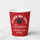 Custom class reunion party paper cups in red and white for a high school, college, or university. Customize with your school name and graduating class under the elegant calligraphy for great personalized alumni celebration decor.
