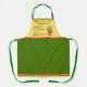 Red Hot Chili Peppers Salsa text with red peppers and green leaves on mustard color and lime green bottom background with red trim and straps. Salsa recipe printed in black text on mustard background top of apron. Mexican style. Red peppers art by Patricia Villa.