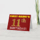 This birthday greeting card design features a message like "FIRST-NAME’S 11th BIRTHDAY!", with the "11th" having a faux/imitation gold-like color appearance. The recipient’s name on the front can be personalized, and the front background is colored red. It also features a personalized birthday greeting message on the inside. A birthday greeting card like this could perhaps be given to somebody in celebration of their eleventh birthday. [~Z0000184]