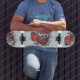 On a pale blue background, is a red Japanese koi fish swimming with waves coming out on either side. The perfect gift for any skateboarder.