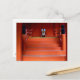 Postcard featuring photography of a red shrine with two tiny turquoise coloured vases.