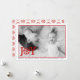 Modern red joy and snowflake minimal Christmas holiday flat photo card displaying a photo and the word “JOY” in red with a snowflake instead of the letter O and a white border around it. The back includes a pattern of red snowflakes on white background.
