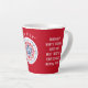 Customizable KING CHARLES III CORONATION Latte Mug in RED, with CUSTOMIZABLE TEXT based on Christian Bible verse in Matthew 20:26. Design shows the rose of England, the thistle of Scotland, the daffodil of Wales and the shamrock of Northern Ireland in a beautiful red and blue floral emblem. The quote reads WHOEVER WANTS TO RULE OVER YOU MUST FIRST BE YOUR SERVANT, which is based on Matthew 20:26, which is repeated on the front and back. You can PERSONALIZE THIS TEXT with your own wording, eg. add your family/organization name. The curved wording reads ICH DIEN (I serve - royal motto) and you can ADD YOUR NAME here instead. This King Charles III Coronation latte mug would make great commemorative gift for you to celebrate this momentous occasion in British royal history with your family, friends, colleagues and clients. Matching gifts available.