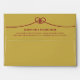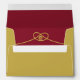 A modern and minimalist burgundy red and yellow gold circle double happiness knot of union, love and marriage on a wedding envelope with personalized return name and address.