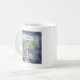 A personalized coffee mug with a whimsical red-striped lighthouse and a colourful beach ball resting against its wall. A grey seagull flies off in the distance. A yellow sun smiles happily in the sky. Billowing stormy clouds closing in from behind. All done in watercolors.