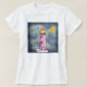 A t-shirt with a whimsical red-striped lighthouse and a colourful beach ball resting against its wall. A grey seagull flies off in the distance. A yellow sun smiles happily in the sky. Billowing stormy clouds closing in from behind. All done in watercolors.