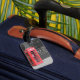 This luggage tag features a photograph of an iconic red London telephone box on a black and white background. The reverse side is customizable for you to add your name and address.
