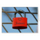 Photograph of a red "love lock" padlock on a fence with red heart engraved on top. Customizable text, "forever" printed along bottom.