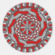 This concentric circle design contains layers of geometric patterns that resemble gears that you might find in modern or even alien machinery, in shades of red and grey.
