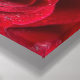 Beautiful macro photograph of a red rose blossom. Big water droplets sit on its delicate petals giving it a fresh summery look.
