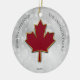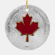Maple leaf in deep red. Stylized with a faux gold metallic border around the edges. Set on a bokeh snow like background. Personalize with your greetings, name and year in black uppercase font. Image and text set on both sides of the ornament.