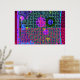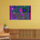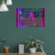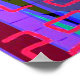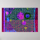 Red, green, teal, black and aqua dominate this complex maze pattern with magenta, lime and sky blue irregular shapes scattered on a geometric background, all encased in a red and fuchsia square boundary. The juxtaposition of colours is amazing! Design by D. Flouton 2012.