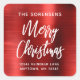 This elegant, trendy holiday return address label features the message "Merry Christmas" in white handwriting-style brush font on a background of ruby red faux brushed metal. Customize with your family's name above and address below in white sans serif font.