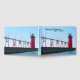 A vibrant red South Haven lighthouse in Michigan stands tall at the end of a pier, contrasting against the clear blue sky.