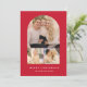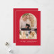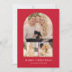 Modern holiday photo card featuring 3 of your photos arranged in an arch-shaped grid layout. Personalize the front of the multi-photo holiday card with your custom greeting and family name displayed in white lettering with a red background. The card reverses to a subtle red and white dot pattern.