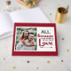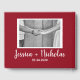 The front of this red modern wedding guestbook features a romantic caption written in red and grey fonts, that reads "All because two people fell in love", with a customizable picture on a white frame.