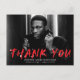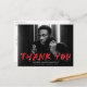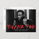 Stylish, modern graduation thank you postcard featuring the graduate's horizontal photo with "Thank You" in red lettering with white paint splatters. Personalize the front of the thank you postcard by adding the graduate's name, school name, and graduation year. The back of the graduation thank you postcard features your return address and space for a typed or handwritten thank you message.